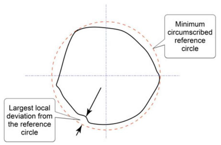 Local roundness deviation is defined as the minimum distance between a point on a roundness profile and the reference circle (Fig. 7.32).