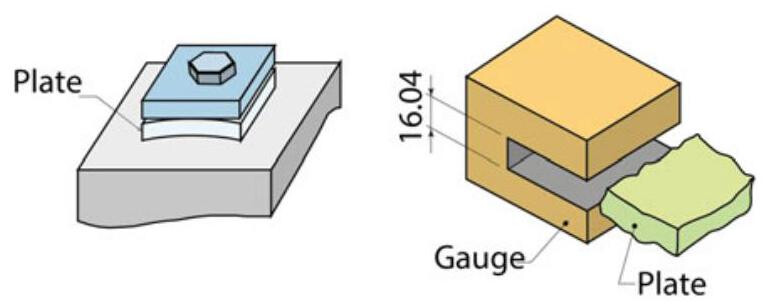 Fig. 7.25 By applying the flatness tolerance to the thickness dimension of the plate, it is possible to control the flatness error of the derived median plane. The control gauge is obtained from the virtual conditions \left( {{16} + {0.04}\mathrm{\;{mm}}}\right)