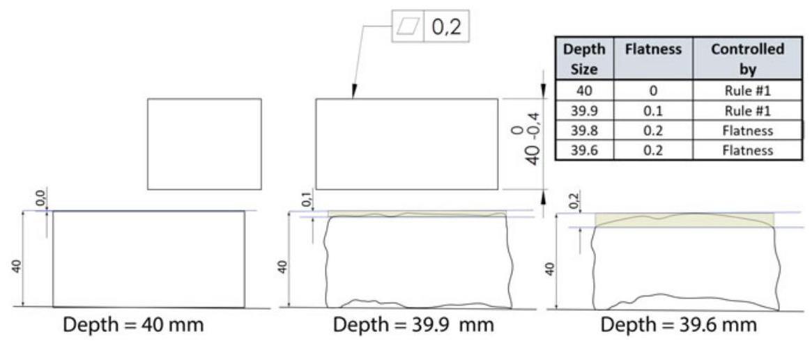 Fig. 7.20 Application of a flatness tolerance to a flat surface of a prismatic component. As the principle of independency comes into force by default, the MMVC is obtained by summing the maximum material dimension with the flatness tolerance, which may be greater than the dimensional tolerance