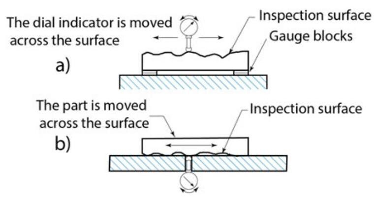 Fig. 7.22 Inspecting flatness: a control of the flatness error by means of an adjustable support or b by means of a dial indicator placed below the surface plate