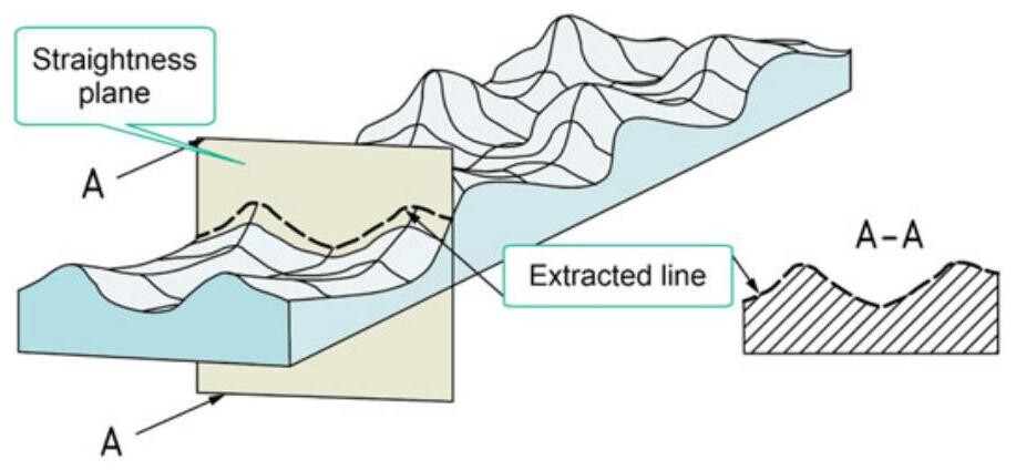 According to this standard, the extracted straightness line is a digital representation of the intersection of the real surface and a straightness plane, which includes the normal of the real surface (Fig. 7.6). The straightness profile is an extracted line intentionally modified by a filter. In the evaluation of a straightness deviation of an integral feature with a given tolerance, the straightness profile should be contained between two lines that are distant from each other by a value that is less than or equal to the specified tolerance value.