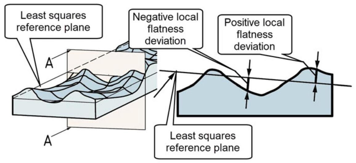 Local flatness deviation is defined as the deviation of a point on a flatness surface from the reference plane, in a direction normal to the reference plane.