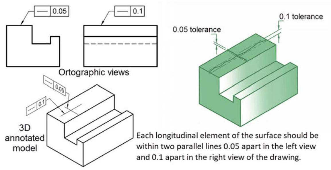 Figure 7.15 shows the use of a straightness tolerance on a flat surface to control line elements in multiple directions. Each line element of the surface should lie between two parallel lines separated by the amount of the prescribed straightness tolerance and in a direction indicated in the orthographic view or by the supplemental geometry of the model. In ASME Y14.5:2018, the supplementary geometry in the annotated model makes the use of the intersection plane (used in the ISO standard) unnecessary.