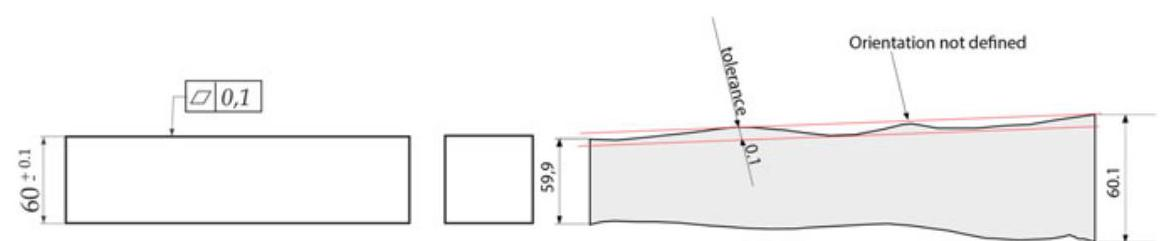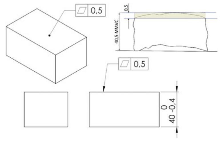 Fig. 7.20 Application of a flatness tolerance to a flat surface of a prismatic component. As the principle of independency comes into force by default, the MMVC is obtained by summing the maximum material dimension with the flatness tolerance, which may be greater than the dimensional tolerance