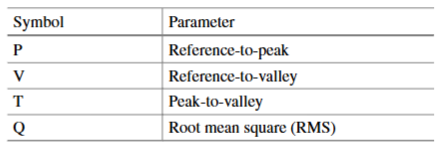 The Table 7.1 shows the parameter specification elements that can be used for form specifications, i.e. specifications that do not reference datums. T may be used to indicate the total range of deviations, i.e. the default parameter. P, V should be used to indicate the peak height, and the valley depth, respectively. Q should be used to indicate the square root of the sum of the squares.