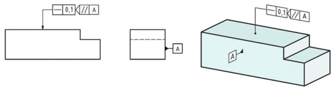 In the case shown in Fig. 7.2, the straightness tolerance is limited by two parallel lines 0.1mm apart,in the direction specified by the plane intersection symbol (or, in the case in which a symbol is missing, in the direction parallel to the projection plane). The tolerance zone is therefore limited by two parallel lines at a distance specified by tolerance t, at any intersection plane parallel to datum A (Fig. 7.3).