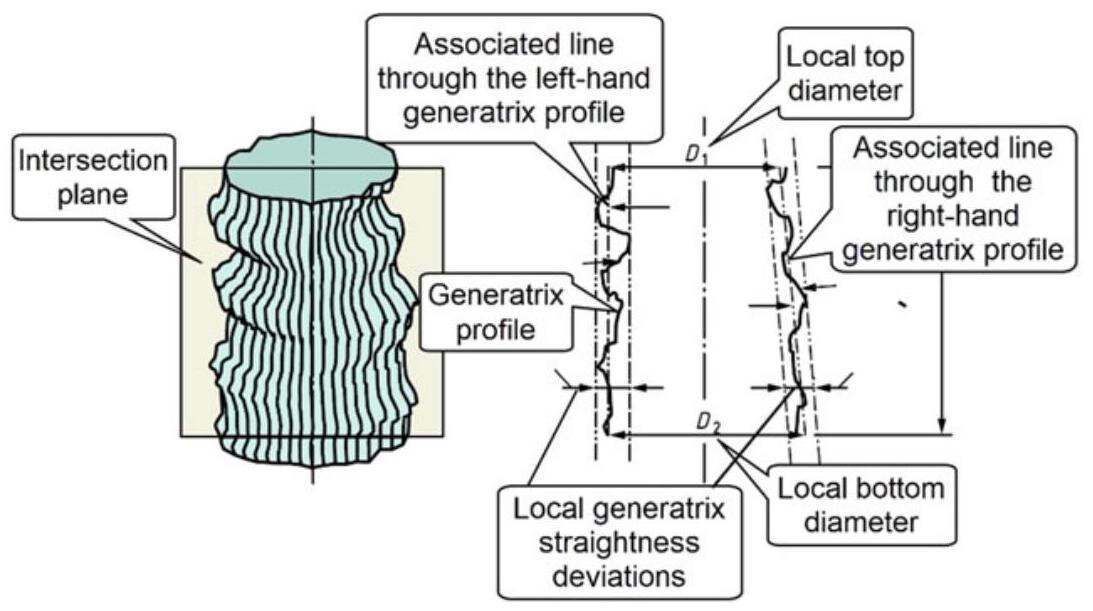 The local generatrix straightness deviation is a straightness deviation value calculated from a generatrix profile obtained from an intersection of a plane through the axis of the least squares reference cylinder and the extracted cylindrical feature (Fig. 7.42).