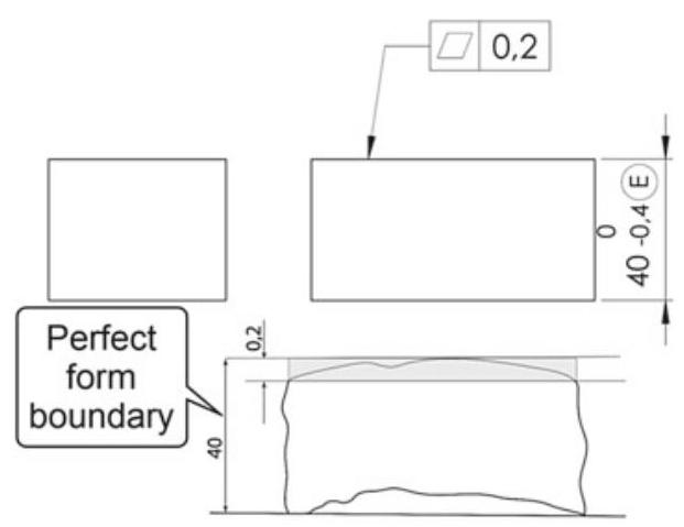 Fig. 7.20 Application of a flatness tolerance to a flat surface of a prismatic component. As the principle of independency comes into force by default, the MMVC is obtained by summing the maximum material dimension with the flatness tolerance, which may be greater than the dimensional tolerance