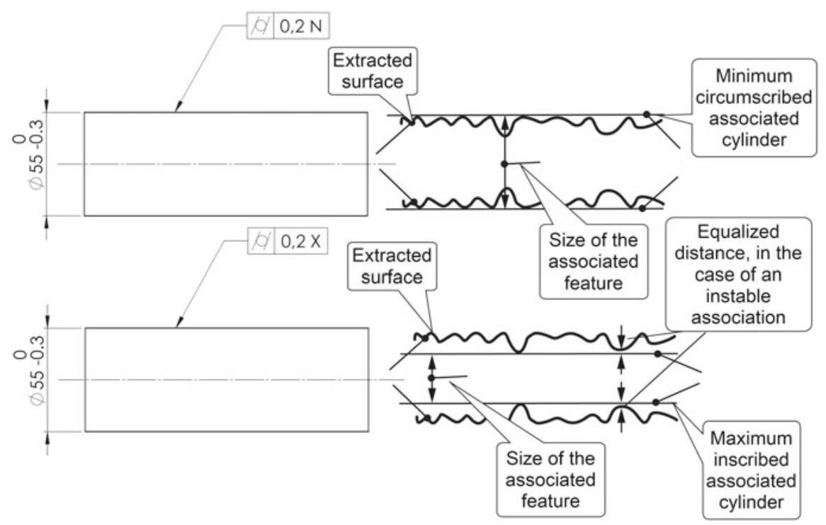 Again in this case, it is possible to indicate the reference cylinder association methodology, from which it is possible to derive two coaxial cylinders, which can be used to obtain the cylindricity measurement. The association shown in Fig. 7.44 is in fact obtained with the smallest circumscribed cylinder (N and X modifiers).