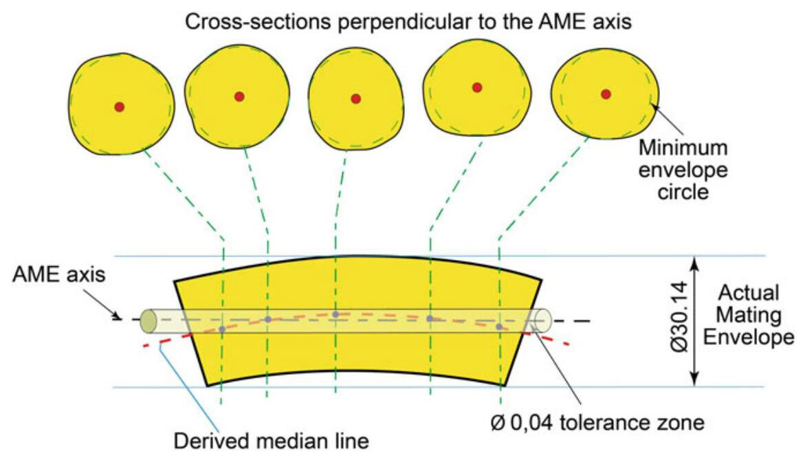 Figure 7.14 shows the concept of a derived median line in the ASME standards, obtained from the set of central points of the singular perpendicular sections of the axis of the smallest restricted cylinder (AME): the derived median line should fall within a cylinder centred on the nominal axis of an envelope of perfect form.