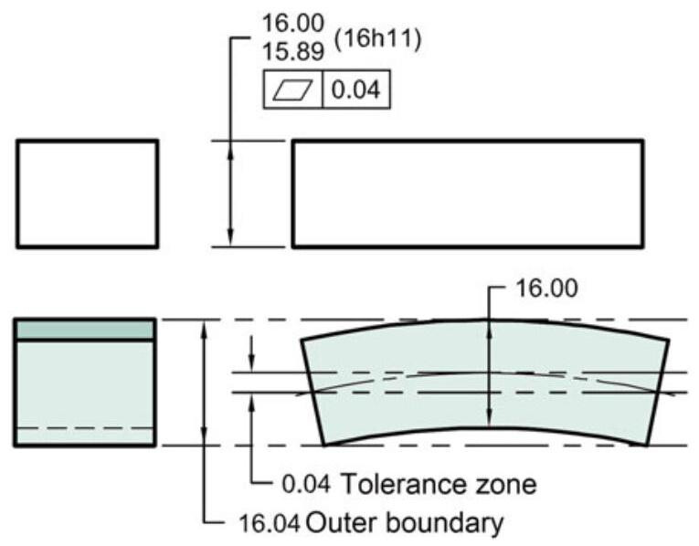 Fig. 7.23 In the case of the ASME standard, since the envelope requirement comes into force by default, the use of the flatness tolerance has the purpose of limiting the error when the workpiece is produced with dimensions close to the least material size. The flatness tolerance zone falls within the dimensional error