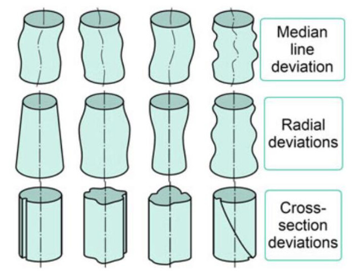 • Radial deviations, i.e. variations in the cross-section dimension: the deviation of a nominal cylindrical workpiece which has all the cross-sections circular and concentric to a straight axis, but whose diameters vary along the axis according to simple or complex laws or even randomly (typical deviations include conical, barrel or more complex forms).