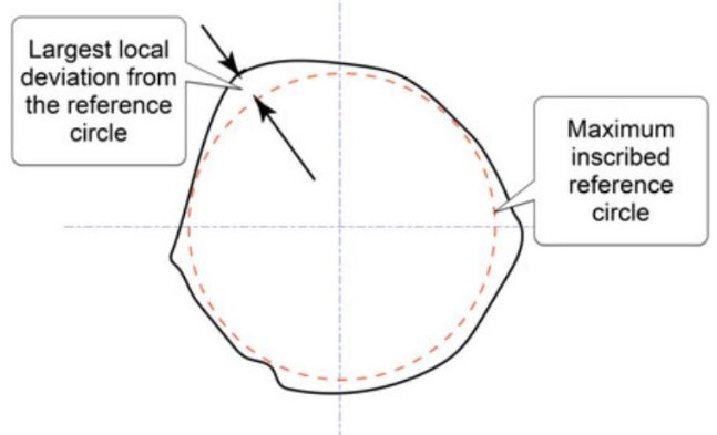 Local roundness deviation is defined as the minimum distance between a point on a roundness profile and the reference circle (Fig. 7.32).