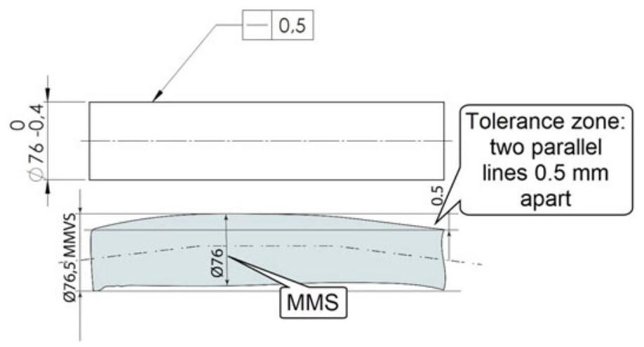Fig. 7.4 Application of a straightness tolerance to the surface of a shaft. As the principle of independency comes into force by default, the maximum virtual boundary is obtained by summing the maximum material size with the straightness tolerance, which can be greater than the size tolerance
