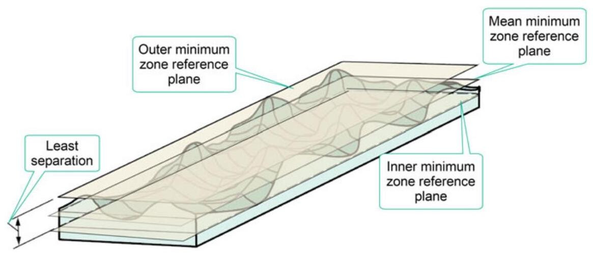 • The minimum zone reference planes method (MZ), which best satisfies the tolerance zone definition (Fig. 7.18) with two parallel planes that enclose the flatness surface and have the least separation.