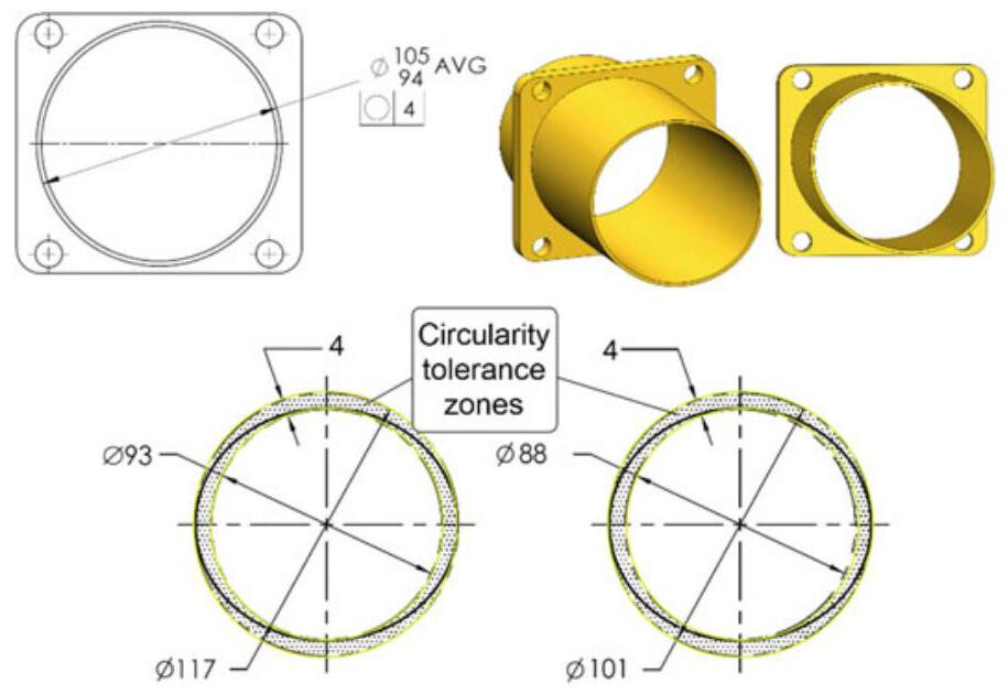 For flexible revolute components in a non-restrained condition, it is possible to specify an average diameter with the abbreviation “AVG”, that is, the average of several diametric measurements across a circular or cylindrical feature. The individual measurements may violate the limits of size, but the average value should fall within the limits of size (Fig. 7.36). Moreover, the circularity tolerance can be greater than the size tolerance on the diameter.