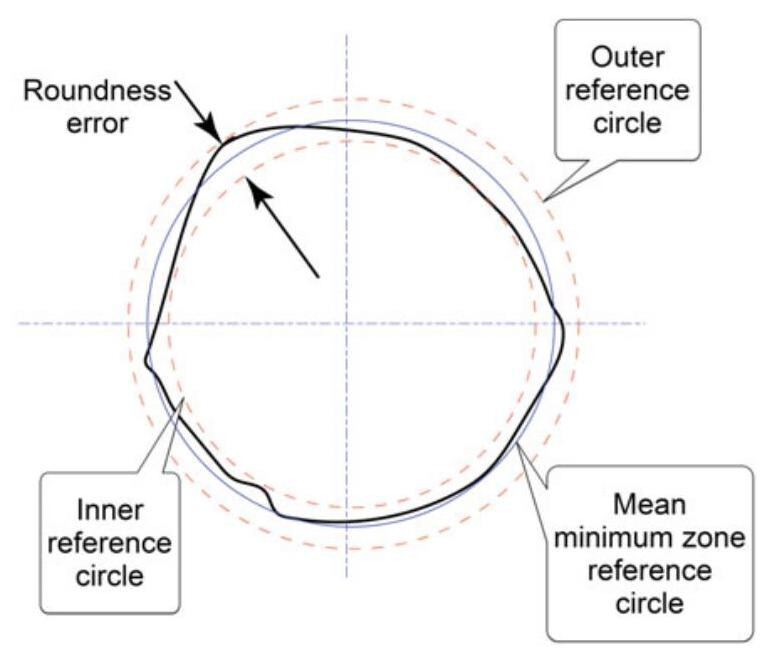 When determining the roundness deviation, it is necessary to establish a reference circle, that is, an associated circle that fits the roundness profile according to specified conventions, to which the deviations from roundness and the roundness parameters refer. The inspection of roundness, by means of CMM measuring machines, foresees, starting from the extracted line, the association of a reference circle, with respect to which two concentric circles can be defined in order to calculate the magnitude of the tolerance zone that contains the circle itself.