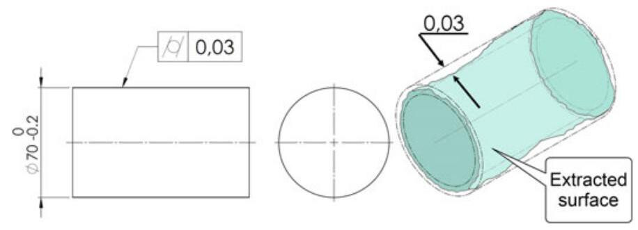 According to this standard, the extracted surface is a digital representation of the real surface, while the cylindricity surface is an extracted surface (of a cylindrical type) intentionally modified by a filter.