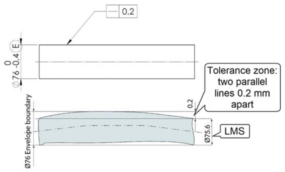 Fig. 7.21 When the envelope requirement (circled E symbol next to the diameter value) is applied, the flatness should be perfect when the component is produced at the maximum material size and the geometrical tolerance should always be less than the dimensional one