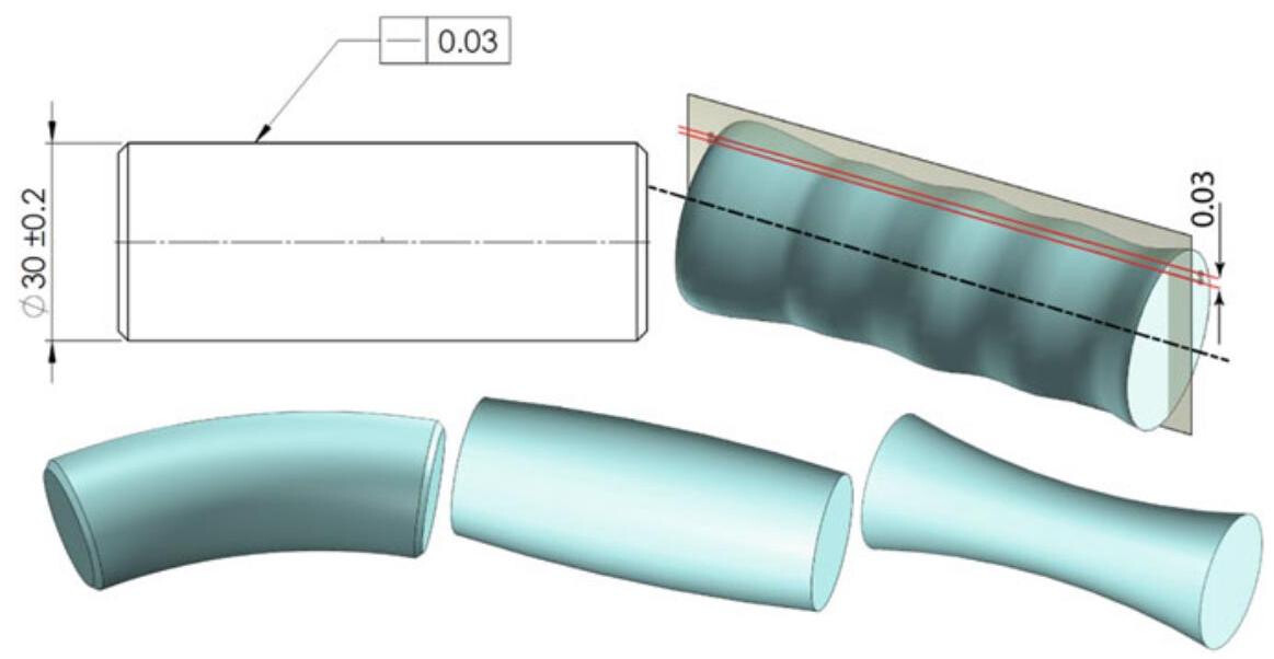 Three possible types of error are visible on the cylindrical surface shown in the same figure, that is, of concavity, convexity and of bending. A straightness tolerance applied to a flat surface only controls the straightness in the direction parallel to the projection plane.