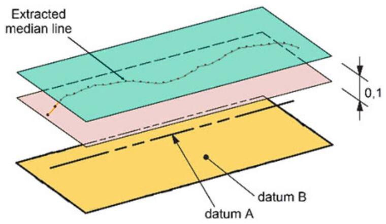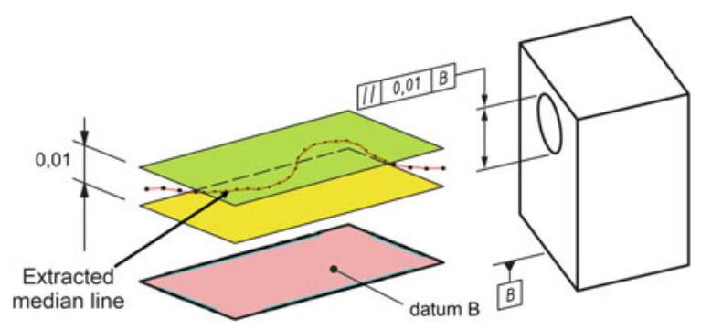 A parallelism specification of a median line related to a datum plane, as shown in Fig. 8.6, where the extracted median line should fall between two parallel planes 0.01mm apart,which are parallel to datum plane B.
