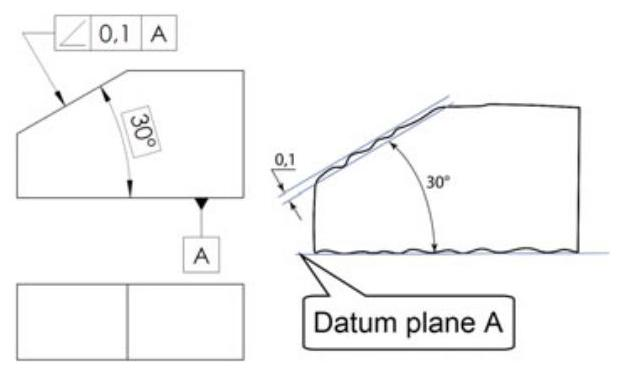 An angularity control defines the deviation of a part feature with respect to a determined inclination,and it is used for geometries that are neither at 180° nor at 90° from each other.