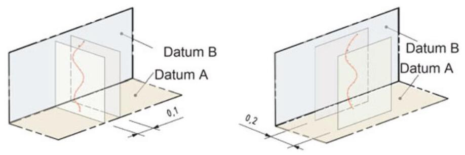 Each extracted line in Fig. 8.7, parallel to datum plane B, as specified by the intersection plane indicator, should fall between two parallel lines 0.2 apart, which are parallel to datum plane A. The tolerance zone is limited by two parallel lines 0.2mm apart and oriented parallel to datum plane A, that is, the lines lying on a plane parallel to datum plane B.