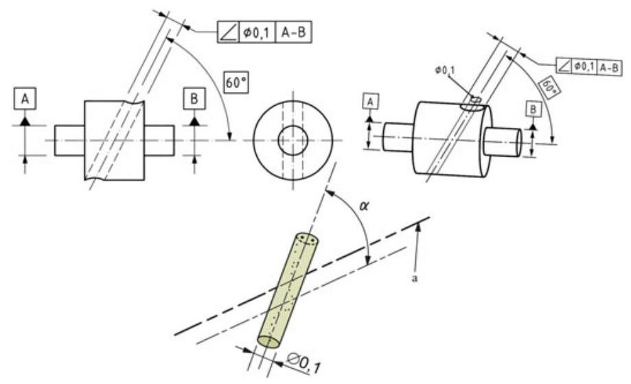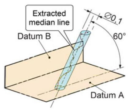 In the case of Fig. 8.20, the extracted median line should fall within a 0.1 diameter cylinder,which is inclined at a theoretically exact angle of 60° with respect to the common datum straight line A-B. The considered line and the datum line are not on the same plane.