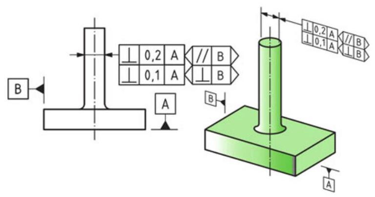 The toleranced feature controlled by a perpendicularity specification may be either an integral feature or a derived feature. The theoretically exact dimension (TED) angles that are locked between the nominal toleranced feature and the datums should be defined by means of implicit TED (90°). The control of perpendicularity (symbolised by two orthogonal dashes) is generally used to qualify a secondary or tertiary datum feature.