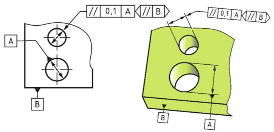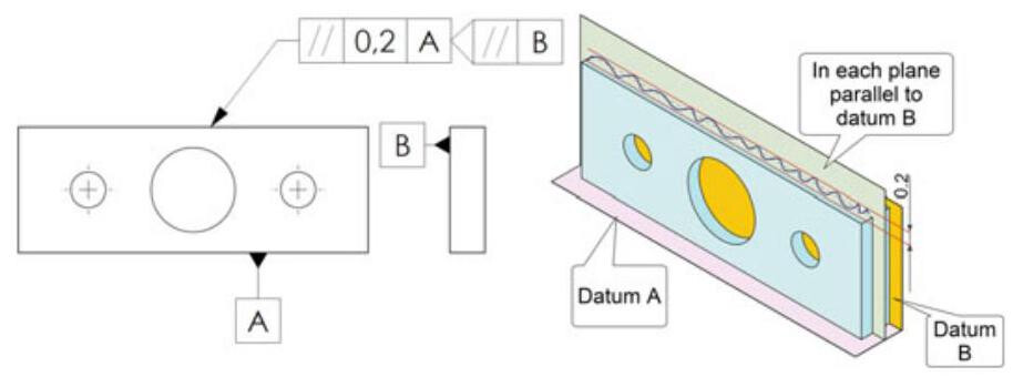 Fig. 8.1 Parallelism specification of a median line related to a datum axis; the planes that limit the tolerance zone are parallel to datum plane B, as specified by the orientation plane indicator