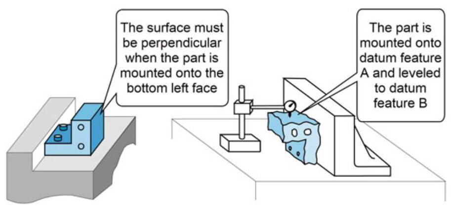 As a result, in the case of Fig. 8.17, the perpendicularity tolerance is applied with two datum planes, because the assembly of the workpiece implies the alignment with surface B; the control takes place by first placing the workpiece on the primary plane and then on the secondary plane (Fig. 8.18).