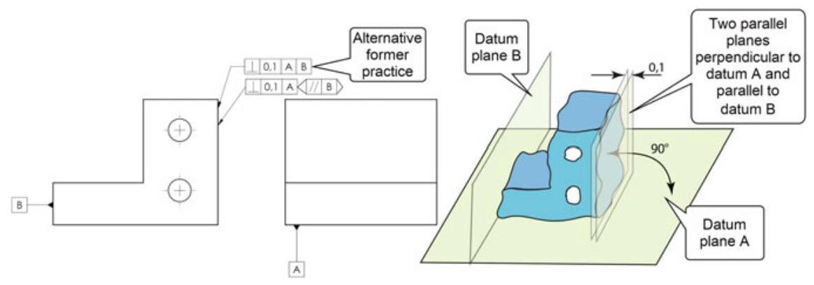 Fig. 8.17 Drawing of a workpiece subject to a perpendicularity requirement with two datum planes. The extracted surface should fall between two parallel planes 0.1mm apart,which are perpendicular to datum plane A and parallel to datum B, as specified by the orientation plane indicator
