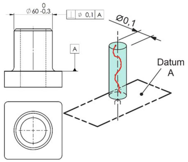 When the perpendicularity tolerance is applied to a cylindrical feature of size and a maximum material requirement (MMR) is added, as shown in Fig. 8.19, the control of the orientation deviation no longer refers to the median line, but to the entire extracted feature (MMVC boundary), and it should not violate the MMVC virtual condition of 60.1mm,which is calculated by summing the maximum material size (60mm) with the perpendicularity geometrical tolerance (0.1mm).