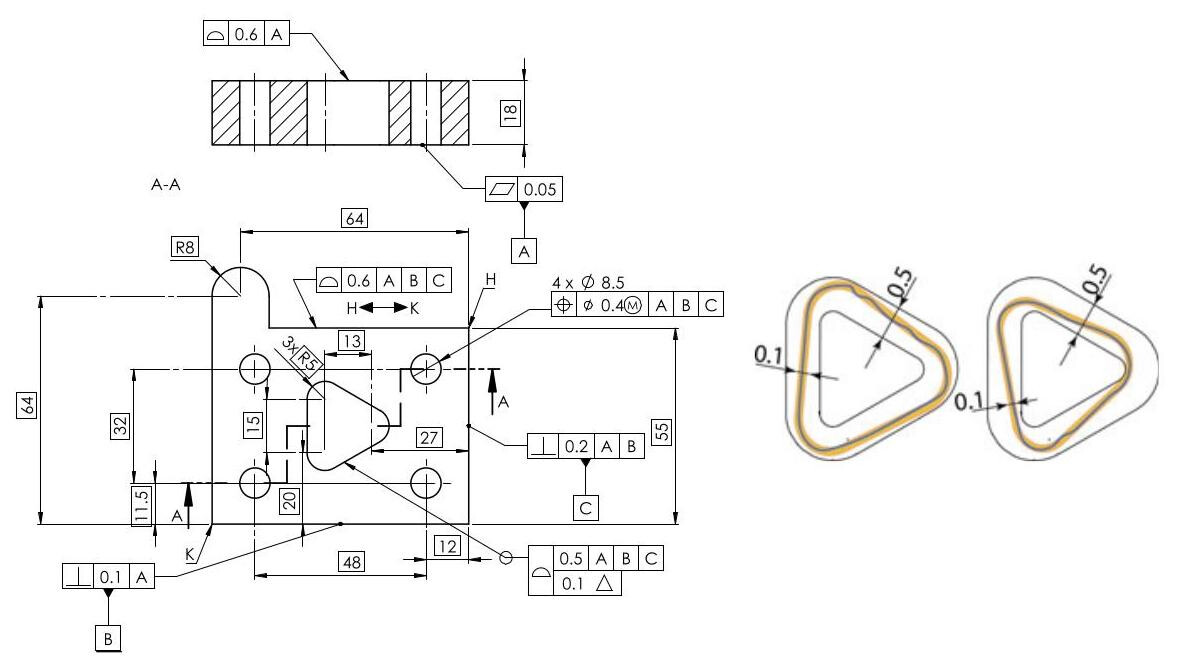 The function of the dynamic profile is to allow form to be controlled independently of size. It is a small triangular symbol \Delta that can be inserted inside the feature control frame of a profile control (after the tolerance value, as in Fig. 10.29). The tolerance of the profile is usually applied to the theoretical or ideal profile (indicated with basic dimensions), for which the shape and size are checked: through the use of the dynamic profile modifier, the error of form is defined independently of the size.