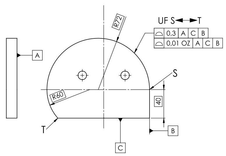 The non-redundant degrees of freedom for the tolerance zone defined by the upper tolerance indicator are locked by means of reference to a datum system, and the UF modifier could therefore have been omitted. In the case of the tolerance zone defined by the lower tolerance indicator, the UF modifier is necessary to synchronise the offset of the two parts of the tolerance zone.