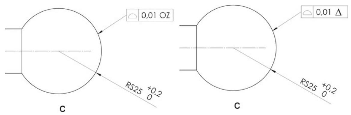For example, let us suppose that the spherical end of a pin should be controlled by the profile of a surface. Without the dynamic profile modifier, the diameter of the sphere should be indicated with a basic dimension, because the control must be applied to an “ideal profile”. With this new modifier, the diameter of the sphere can still have its dimensional tolerance \pm ,but with a smaller dynamic profile value to control the shape.