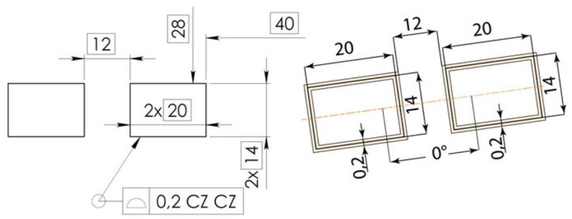 The tolerance zone is a tolerance zone pattern consisting of two tolerance zone patterns (CZ CZ), composed of four tolerance zones, in a space between two parallel planes {0.2}\mathrm{\;{mm}} apart and constrained in orientation (implicit TEDs 4 \times {90}^{ \circ } ) and in location (explicit TEDs 20 × 14). The two tolerance zone patterns are constrained in orientation to be parallel (implicit TED of {0}^{ \circ } ) and in location to be {12}\mathrm{\;{mm}} apart in one direction (explicit TED) and aligned (implicit TED of 0\mathrm{\;{mm}} apart) in the perpendicular direction, without any external constraint from a datum.