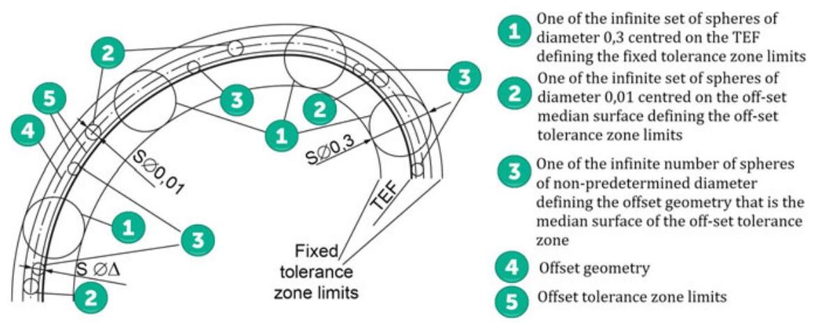 Figure 10.17 shows the interpretation of the drawing in Fig. 10.16, where a combination of a fixed tolerance zone with a larger tolerance value (0.3) and an off-set tolerance zone with a smaller tolerance value (0.01) are defined. The off-set tolerance zone is off-set by a non-predetermined amount, either inside the material or outside the material, compared to the TEF. The combination of the two specifications controls the shape of the toleranced feature within the off-set tolerance zone, which can adapt to the toleranced feature, as long as the off-set tolerance zone remains within the fixed tolerance zone.