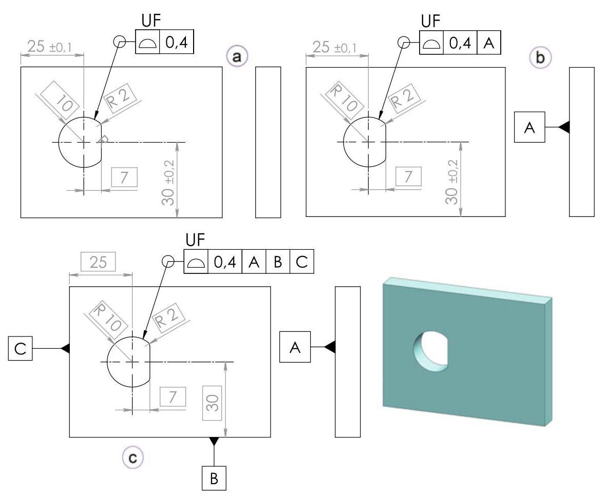 • the size, form, orientation and position at the same time (Fig. 10.11c). Because all the non-redundant degrees of freedom for the tolerance zone are locked by means of reference to a datum system, the UF modifier could be omitted without changing the practical meaning of the specification. In this case, the tolerance zone is completely constrained by the datum system.