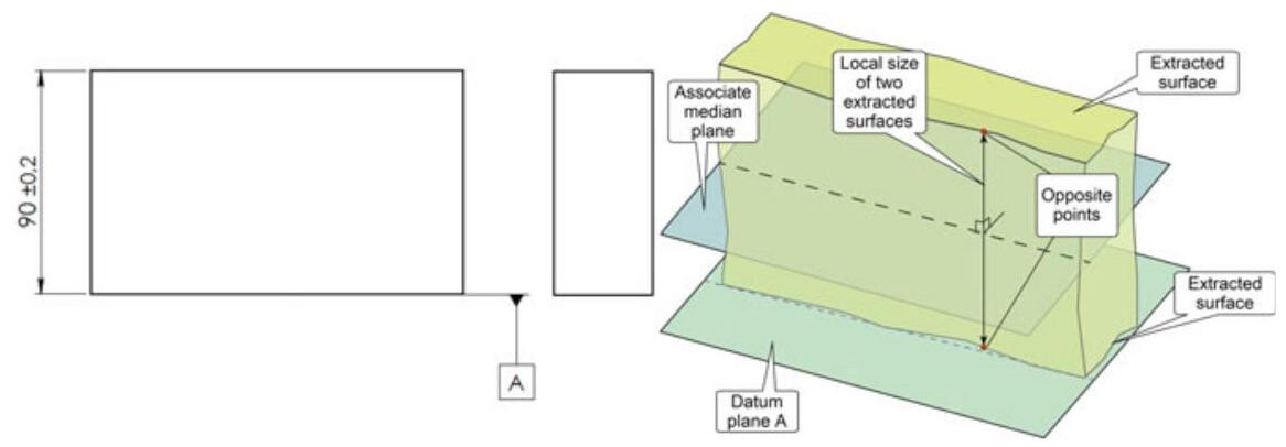Fig. 10.2 From the metrologist’s point of view,the {90} \pm {0.2}\mathrm{\;{mm}} dimension inspection is a complicated procedure, since according to ISO 14660-2:1999, the local size of two parallel extracted surfaces is the distance between two points on opposite extracted surfaces, where the connecting lines of sets of opposite points are perpendicular to the associated median plane obtained from the extracted surfaces. Furthermore, in this way, the correct distance of the surface from datum A is not checked