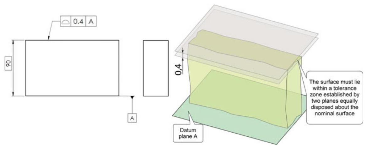 Moreover,as can be seen in Fig. 10.3,the tolerance of \pm {0.2} on the height of the workpiece is substituted by the tolerance on the profile. The tolerance zone remains unvaried (±0.2) with respect to the theoretically exact size), but the profile control provides a clear definition of the tolerance zone, with uniform boundaries relative to a datum system. The location of the surface, as well as the parallelism, the flatness error and, naturally, the size are also controlled through the tolerance on the profile.
