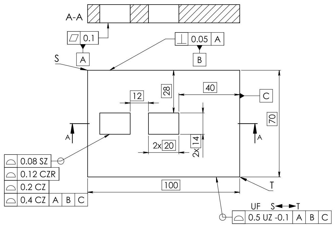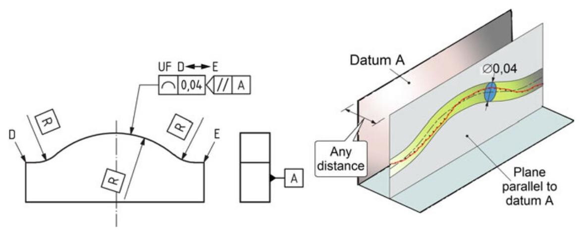 The non-redundant degrees of freedom for the tolerance zone defined by the upper tolerance indicator are locked by means of reference to a datum system, and the UF modifier could therefore have been omitted. In the case of the tolerance zone defined by the lower tolerance indicator, the UF modifier is necessary to synchronise the offset of the two parts of the tolerance zone.
