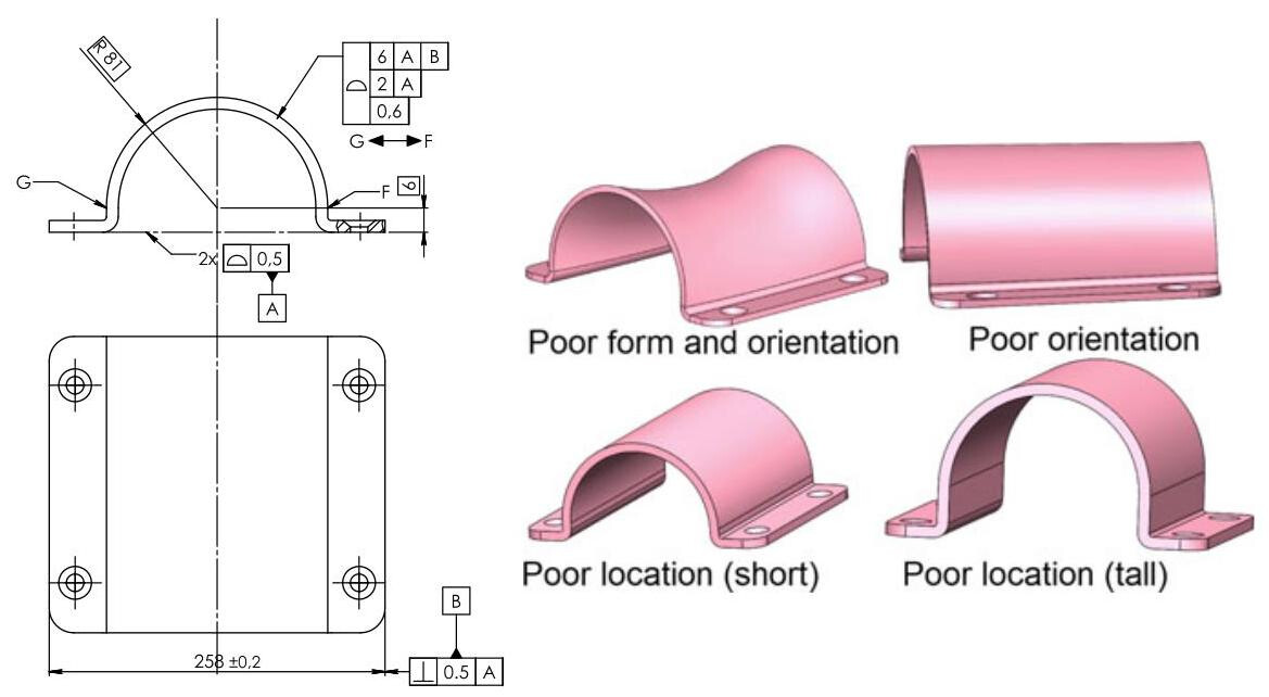 A geometrical tolerance on a profile is one of the most versatile and powerful instruments that can be used for functional dimensioning, in that it is not just a form tolerance, it also controls the size, orientation, position and, naturally, the form of a feature. A tolerance on a profile is usually only indicated on complex shaped features, but its use has spread over time to even simple profiles, in such a way that it has become the tolerance that is used the most frequently by designers.