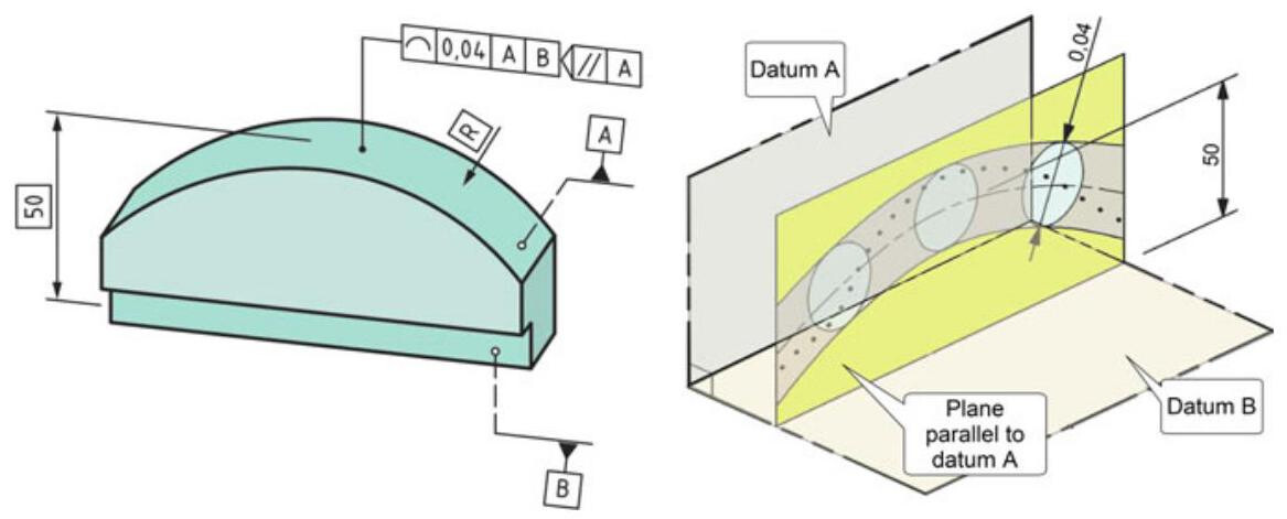 The ASME Y14.5 standard also foresees the use of composite profile tolerancing for profiles (this is not foreseen in the ISO standards and it is also used for location tolerances), a fact which determines a multiple control of the geometric profile, where the design requirements are such that the tolerance for the location of a part feature is less important than the orientation of the feature (Fig. 10.25). The upper segment of a composite profile feature control frame controls the location of the surface, while the second frame is used to control the orientation of a toleranced feature relative to datum A (from necessity, the value must be smaller). By adding a third segment (without adding a datum), a form tolerance is defined (a flatness tolerance, in this case) and the size is also controlled.