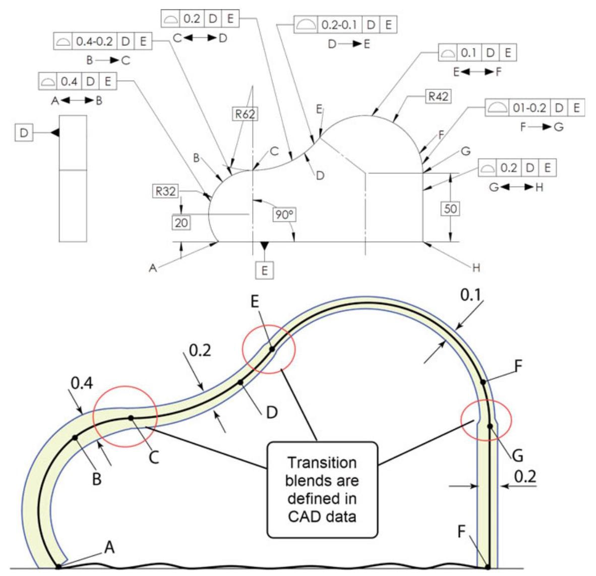 Figure 10.31 shows three abrupt tolerance transitions that occur at points B, C, and D, when different profile tolerances are specified on adjoining segments of a feature. In order to avoid this problem, the From-To symbol is used to smooth the transition areas, as in Fig. 10.32.