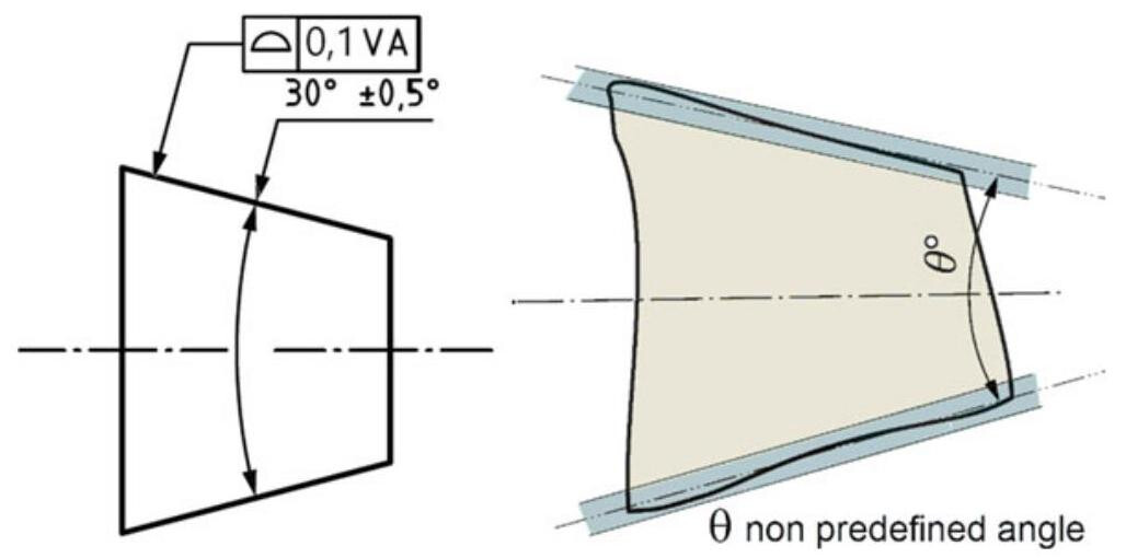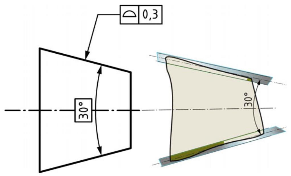 In the case of a feature of angular size, as in Fig. 10.18, a profile specification of a cone surface is indicated with its size considered as fixed, while the angle of the cone is indicated with a theoretically exact dimension (TED). Therefore, the extracted surface of the cone is required to be inside the tolerance zone, without any orientation or location constraints, according to ISO 3040:2016. The tolerance zone consists of the space between two coaxial conical surfaces {0.3}\mathrm{\;{mm}} apart,with a specified theoretical angle. However, when a tolerance zone does not take the nominal size into account, the VA modifier (variable angular size) should be indicated.