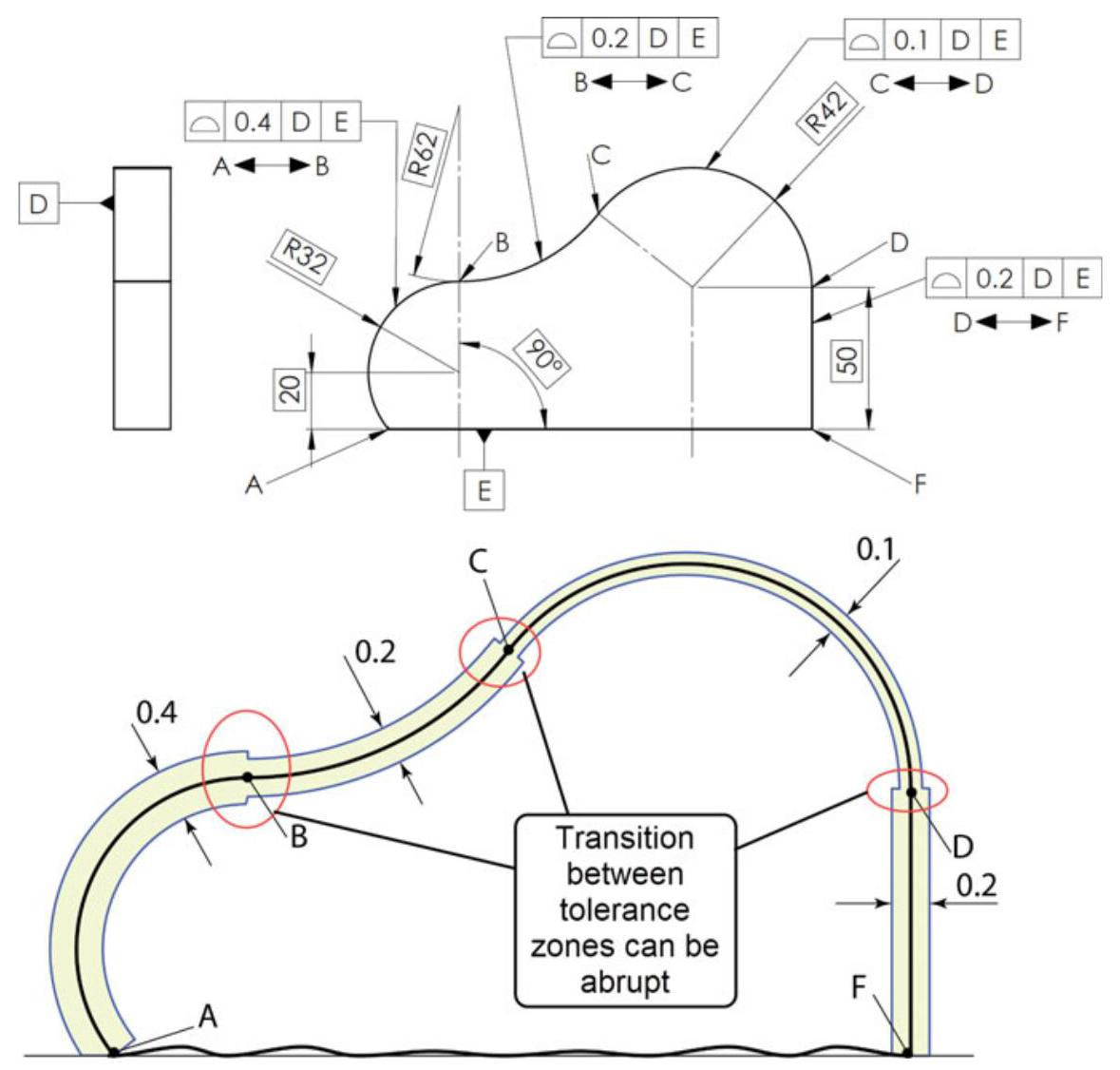 Fig. 10.31 Non-uniform profile tolerance zone with three abrupt tolerance transitions that occur at points B, C, and D, when different profile tolerances are specified