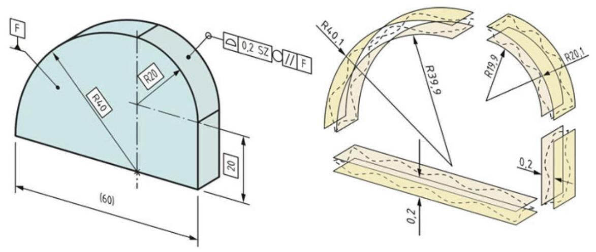 Figure 10.17 shows the interpretation of the drawing in Fig. 10.16, where a combination of a fixed tolerance zone with a larger tolerance value (0.3) and an off-set tolerance zone with a smaller tolerance value (0.01) are defined. The off-set tolerance zone is off-set by a non-predetermined amount, either inside the material or outside the material, compared to the TEF. The combination of the two specifications controls the shape of the toleranced feature within the off-set tolerance zone, which can adapt to the toleranced feature, as long as the off-set tolerance zone remains within the fixed tolerance zone.