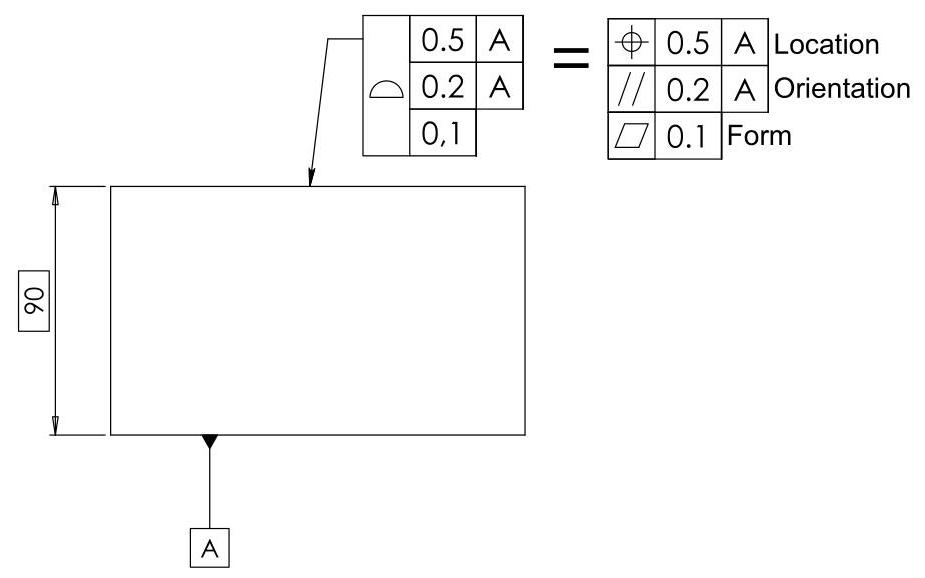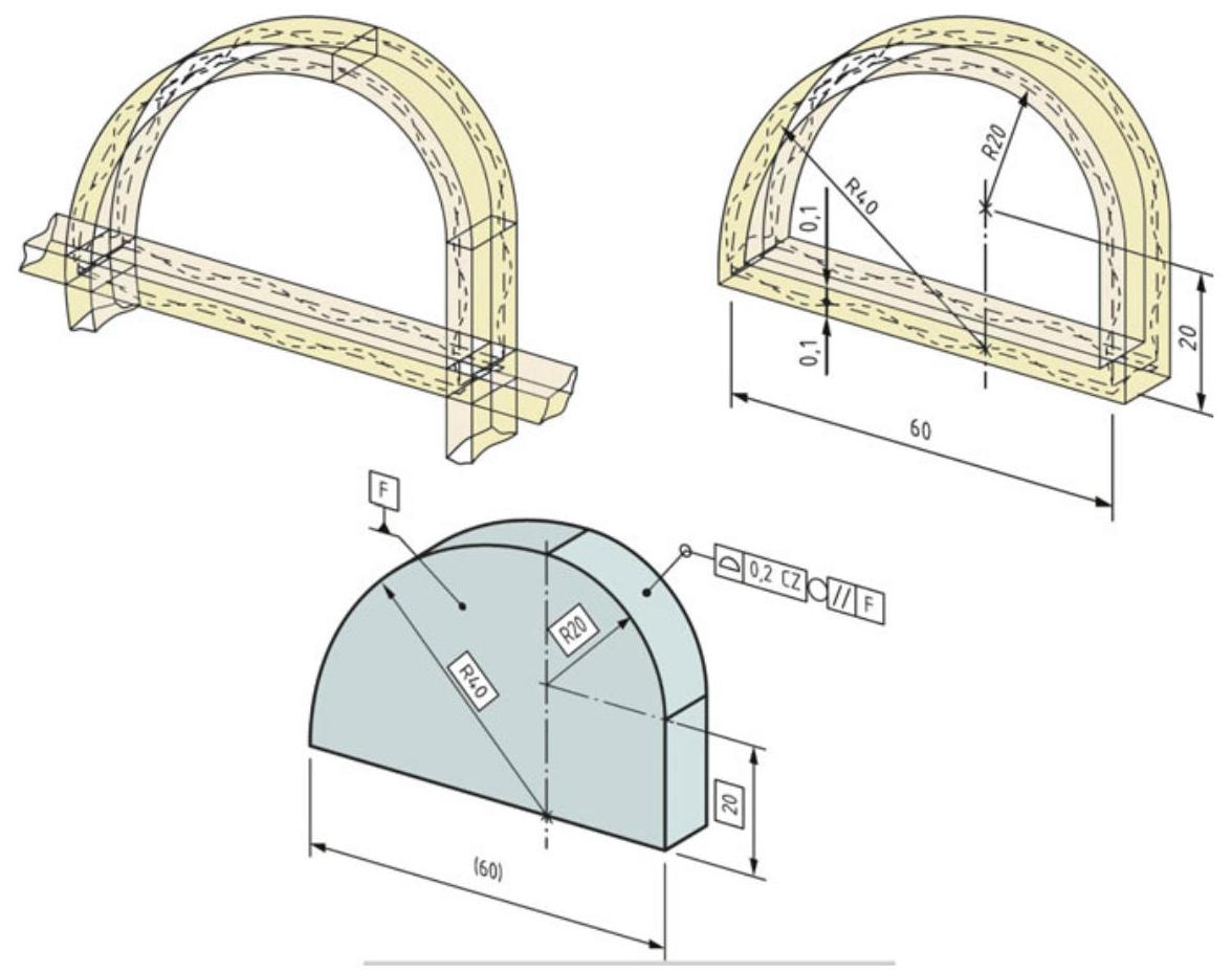 The ASME Y14.5 standard also foresees the use of composite profile tolerancing for profiles (this is not foreseen in the ISO standards and it is also used for location tolerances), a fact which determines a multiple control of the geometric profile, where the design requirements are such that the tolerance for the location of a part feature is less important than the orientation of the feature (Fig. 10.25). The upper segment of a composite profile feature control frame controls the location of the surface, while the second frame is used to control the orientation of a toleranced feature relative to datum A (from necessity, the value must be smaller). By adding a third segment (without adding a datum), a form tolerance is defined (a flatness tolerance, in this case) and the size is also controlled.