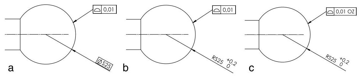 Fig. 10.15 Profile control on a spherical surface. The TEF of the toleranced feature should be defined with TEDs (a). The specification in (b) is ambiguous, since the nominal size of the TEF is not defined by a TED and there is only a \pm tolerance indicated for the size. In this case,the specification element OZ should always be indicated (c)